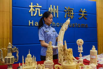 5月28日,杭州海關宣布,今年已先后破獲利用進出境旅檢、郵遞渠道走私瀕危動物制品大案,查獲象牙270余公斤。圖為杭州海關工作人員正在清點查獲的走私象牙,其中不少是精美的工藝品。