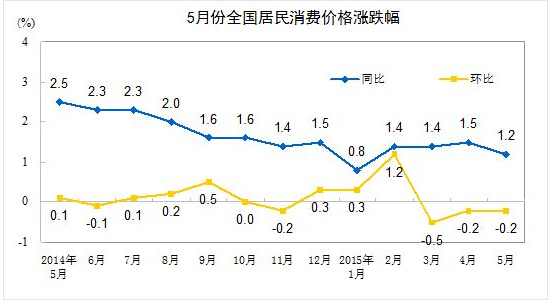 ???? 2015年5月份,全國居民消費價格總水平同比上漲1.2%。其中,城市上漲1.3%,農村上漲1.0%;食品價格上漲1.6%,非食品價格上漲1.0%;消費品價格上漲0.9%,服務價格上漲2.1%。1-5月平均,全國居民消費價格總水平比去年同期上漲1.3%。