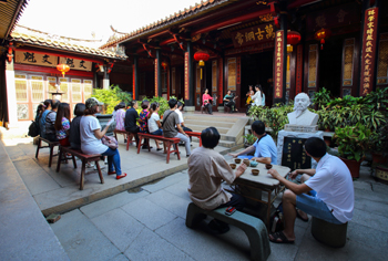 外來游客與本地市民在五店市的莊氏祠堂共聽南音一曲。