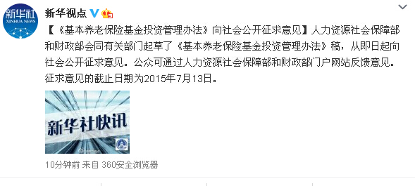 據新華視點微博消息,人力資源社會保障部和財政部會同有關部門起草了《基本養老保險基金投資管理辦法》稿,從即日起向社會公開征求意見。公眾可通過人力資源社會保障部和財政部門戶網站反饋意見。征求意見的截止日期為2015年7月13日。