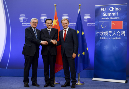 當地時間6月29日,國務院總理李克強在布魯塞爾歐洲理事會總部同歐洲理事會主席圖斯克、歐盟委員會主席容克共同主持第十七次中國歐盟領導人會晤。 李克強表示,中歐應開辟合作新天地,將“一帶一路”、國際產能合作等倡議同歐洲投資計劃有效對接,推動互聯互通和經濟增長,共同開發第三方市場。 圖為會晤前李克強同圖斯克(右1)和容克合影。
