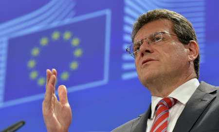 7月1日,在比利時布魯塞爾,歐盟委員會副主席馬羅什·謝夫喬維奇召開關于烏克蘭、俄羅斯和歐盟三方天然氣問題談判的新聞發布會。 烏克蘭石油天然氣公司當天發表聲明說,即日起暫停向俄羅斯天然氣工業股份公司購買天然氣。聲明強調,俄羅斯向歐盟出口的天然氣將繼續過境烏克蘭進行輸送。