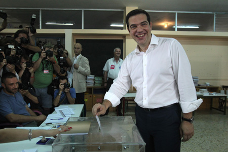 7月5日,在希臘雅典,希臘總理齊普拉斯在一家投票站投票。 希臘5日舉行全民公決,以決定是否接受債權人早先提出的協議草案,這將對如何解決希臘債務危機乃至希臘的歐元區地位產生重要影響。公決初步結果擬于當晚宣布。