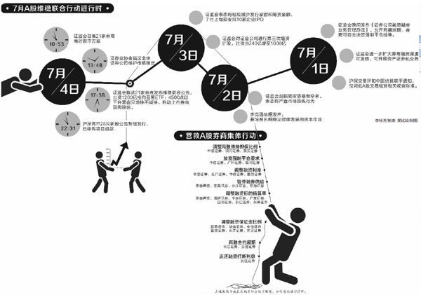 一是21家券商以6月底凈資產15%出資,合計不低于1200億元,用于投資藍籌股ETF;二是上證綜指在4500點以下,在2015年7月3日余額基礎上,證券公司自營股票盤不減持,并擇機增持;三是上市證券公司將積極推動回購本公司股票,并推進本公司大股東增持本公司股票;四是按照證監會發布的《證券公司融資融券業務管理辦法》等相關規定,完善逆周期調節機制,及時調整保證金比例、擔保證券折算率、融券業務規模等相關指標,在風險可控的前提下盡量平穩地做好客戶違約處置工作。