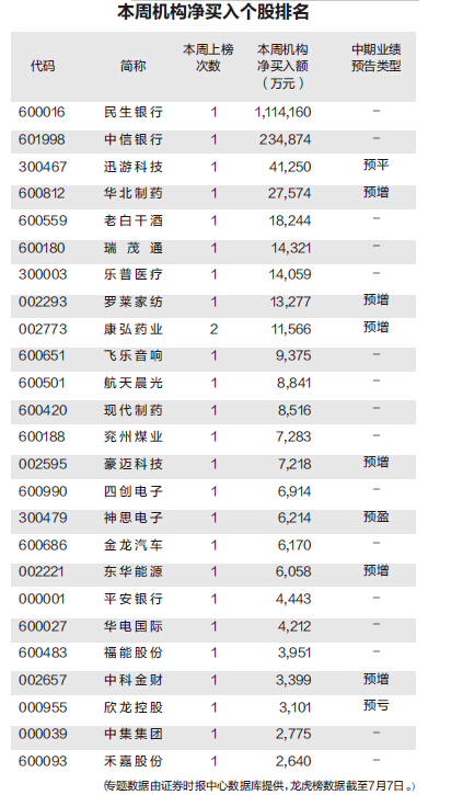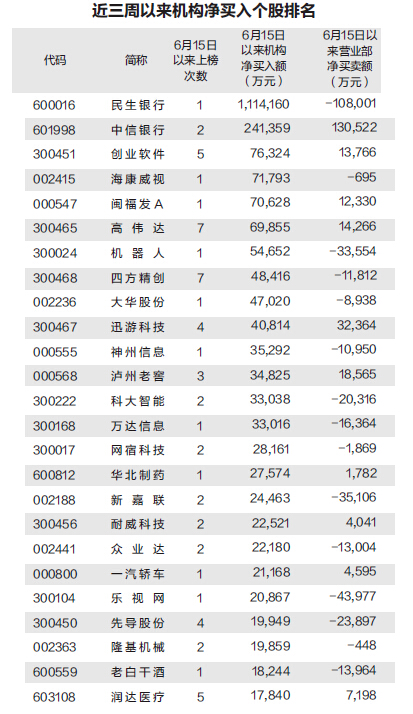 跟隨“國家隊”腳步,本周以來機構席位護盤力度不斷加強。若從機構凈買入額看,以銀行股為代表的藍籌股獲得機構大手筆買入。比如民生銀行,不論從近三周還是本周來看,都是機構凈買入額最大的個股。本周二,民生銀行現身龍虎榜,買入榜單中前四席位均被機構占據,賣出方中,僅有一家機構席位現身,機構席位合計凈買入111億元。近三周來,機構凈買入金額排名第二位是中信銀行,本周和上周各上榜一次,機構席位合計凈買入24億元。(陳文彬)