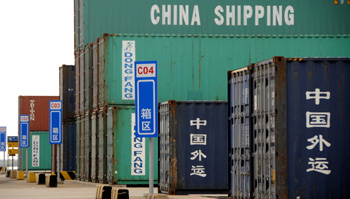 近日,江蘇連云港集裝箱碼頭出口貿易區堆場堆滿了等待裝船的出口貨物。??? 新華社發(王春/攝)?