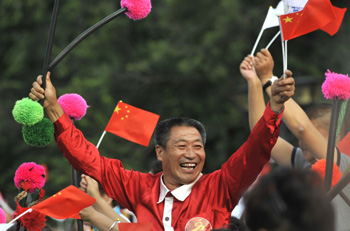 7月31日,在北京市延慶縣望京廣場,當地居民慶祝北京攜手張家口獲得2022年冬奧會舉辦權?!⌒氯A社記者 高健鈞/攝 |