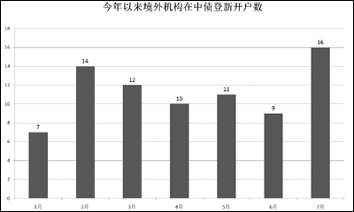 《經濟參考報》記者根據中債登數據統計,在今年新增的79家新增賬戶中,16家為7月一個月“貢獻”,剩余63家在1至6月依次分布為7家、14家、12家、10家、11家和9家。從投資規模上看,今年托管在中債登的境外機構債券投資額高達537億元,其中超半數為7月新增額,達284.5億元。