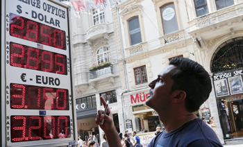 8月18日,在土耳其伊斯坦布爾,一名男子注視匯率顯示屏。土耳其里拉對美元匯率18日再創歷史新低,跌至1美元兌換2.906里拉。自今年初迄今,里拉對美元貶值約20%,為貶值最嚴重的新興市場貨幣之一。同日,土耳其中央銀行決定,維持今年5月以來的利率水平?!⌒氯A社/歐新中文 |