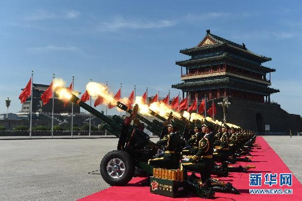 ??? 9月3日,中國人民抗日戰爭暨世界反法西斯戰爭勝利70周年紀念大會在北京隆重舉行。這是禮炮在天安門廣場鳴響。 新華社記者 任軍川 攝