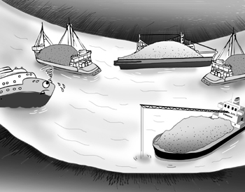 洞庭湖出口處至洞庭湖大橋水道,儼然已成采砂業的“集貿市場”?!督洕鷧⒖紙蟆酚浾咴谶@里看到,上百艘運砂船、挖砂船在進行交易。航運業內將從洞庭湖大橋下通過叫“練梅花樁”,稍有不慎就會發生船只碰撞甚至傾覆的事故,從湘資沅澧四水匯入洞庭湖的船只大多不得不由此“過關”,最后匯入長江。