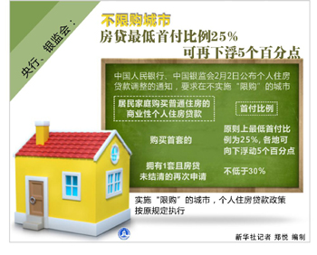 ??? 央行網站2日頒布《關于調整個人住房貸款政策有關問題的通知》,指出在不實施“限購”措施的城市,居民家庭首次購買普通住房的商業性個人住房貸款,原則上最低首付款比例為25%,各地可向下浮動5個百分點。對擁有1套住房且相應購房貸款未結清的居民家庭,為改善居住條件再次申請商業性個人住房貸款購買普通住房,最低首付款比例調整為不低于30%。