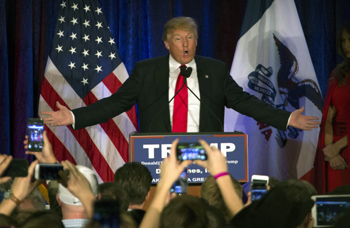 2月1日,美國共和黨總統候選人唐納德·特朗普在美國艾奧瓦州錫達拉皮茲參加競選活動。美國中西部的艾奧瓦州1日晚舉行2016年總統選舉首場黨內預選,打響今年美國總統大選的第一槍?!⌒氯A社/歐新中文? |