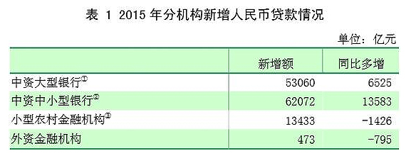 2015年末,金融機構本外幣貸款余額為99.3萬億元,同比增長13.4%,與上年末基本持平,比年初增加11.7萬億元,同比多增1.3萬億元。人民幣貸款余額為94.0萬億元,同比增長 14.3%,比上年末高0.6個百分點,比年初增加11.7萬億元,同比多增1.8萬億元。從人民幣貸款部門分布來看,住戶貸款、非金融企業及機關團體貸款增長略有加快,非銀行業金融機構貸款增多。2015年末,住戶貸款余額為27.0萬億元,同比增長 16.8%,增速比上年末高0.2個百分點,比年初增加3.9萬億元,同比多增5814億元。其中,個人住房貸款比年初增加2.5萬億元,同比多增9250億元。非金融企業及機關團體貸款余額為65.8萬億元,同比增長12.7%,增速比上年末高0.2個百分點,比年初增加7.4萬億元,同比多增8987億元。非銀行業金融機構貸款余額為8539億元,同比增長 66.9%,比年初增加3767億元,同比多增2605億元。從期限看,中長期貸款比年初增加6.7萬億元,同比多增6332億元,增量占比為57.1%。包含票據融資在內的短期貸款比年初增加4.7萬億元,同比多增1.2萬億元;其中,票據融資比年初增加1.7萬億元,同比多增7062億元。分機構看,中資大型銀行和中資中小型銀行貸款同比多增較多。