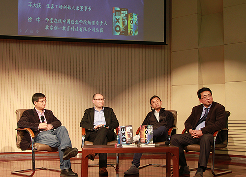 參會嘉賓有教育部長江學者特聘教授陳勁、優客工場創始人兼董事長毛大慶、北京大學新聞與傳播學院教授胡泳和北京創一教育科技有限公司總裁徐中。
