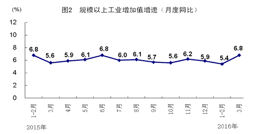 一季度,全國規模以上工業增加值按可比價格計算同比增長5.8%,增速比上年全年回落0.3個百分點,比今年1-2月份加快0.4個百分點。分經濟類型看,國有控股企業增加值同比下降0.1%,集體企業增長2.4%,股份制企業增長7.2%,外商及港澳臺商投資企業增長3.3%。分三大門類看,采礦業增加值同比增長2.1%,制造業增長6.5%,電力、熱力、燃氣及水生產和供應業增長2.6%。工業繼續向中高端邁進。一季度高技術產業和裝備制造業增加值同比分別增長9.2%和7.5%,增速分別比規模以上工業快3.4和1.7個百分點,占規模以上工業增加值比重分別為12.1%和32.4%,比上年同期提高1.1和1.7個百分點。一季度規模以上工業企業產銷率達到97.3%。規模以上工業企業實現出口交貨值25439億元,同比下降3.0%。3月份,規模以上工業增加值同比增長6.8%,環比增長0.64%。
