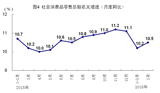 一季度,社會消費品零售總額78024億元,同比名義增長10.3%(扣除價格因素實際增長9.7%),增速比上年全年回落0.4個百分點,比今年1-2月份加快0.1個百分點。其中,限額以上單位消費品零售額34625億元,增長8.0%。按經營單位所在地分,城鎮消費品零售額66920億元,同比增長10.2%,鄉村消費品零售額11105億元,增長11.0%。按消費類型分,餐飲收入8302億元,同比增長11.3%,商品零售69722億元,增長10.2%,其中限額以上單位商品零售32579億元,增長8.0%。3月份,社會消費品零售總額同比名義增長10.5%(扣除價格因素實際增長9.7%),環比增長0.85%。