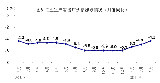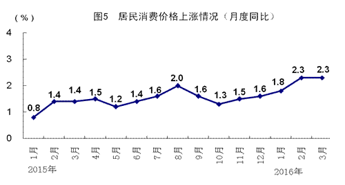一季度,居民消費價格同比上漲2.1%。其中,城市上漲2.1%,農村上漲2.0%。分類別看,食品煙酒價格同比上漲5.1%,衣著上漲1.7%,居住上漲1.3%,生活用品及服務上漲0.4%,交通和通信下降2.0%,教育文化和娛樂上漲1.3%,醫療保健上漲2.9%,其他用品和服務上漲0.6%。在食品煙酒價格中,糧食價格上漲0.6%,豬肉價格上漲24.1%,鮮菜價格上漲27.3%。3月份,居民消費價格同比上漲2.3%,環比下降0.4%。一季度,工業生產者出廠價格同比下降4.8%,3月份同比下降4.3%,環比上漲0.5%。一季度,工業生產者購進價格同比下降5.8%,3月份同比下降5.2%,環比上漲0.3%。