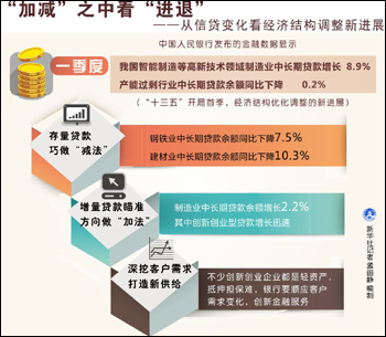 信貸投放領域的變化進一步顯現“供給側改革”的內涵。今年一季度末,產能過剩行業中長期貸款余額同比下降0.2%,首次出現負增長,其中,鋼鐵業中長期貸款余額同比下降7.5%,建材業中長期貸款余額同比下降10.3%。與此同時,經濟重點領域和薄弱環節的信貸投放增長較快。如,小微企業貸款增速為14.5%,比大型企業和中型企業貸款增速分別高2個和5個百分點,高于全部企業貸款增速2.4個百分點。