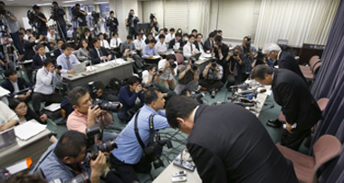 4月26日,在日本東京,日本三菱汽車公司社長相川哲郎(右中)出席記者會時鞠躬。三菱汽車上周承認,該公司有四款微型汽車在燃油經濟性測試中存在違規操作,以美化排放水平?!⌒氯A社/美聯? |