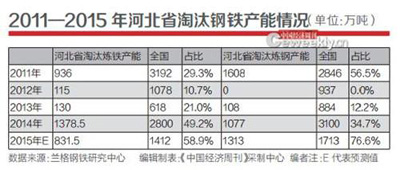 2016年2月4日,國務院發布《關于鋼鐵行業化解過剩產能實現脫困發展的意見》。意見明確,從2016年開始,在近年來淘汰落后鋼鐵產能的基礎上,用5年時間再壓減粗鋼產能1億~1.5億噸。蘭格鋼鐵研究中心研究員徐莉穎向《中國經濟周刊》記者介紹,截至2015年底,河北省鋼鐵產能約在3億~3.2億噸。參考河北省“十三五”產能控制目標為2億噸,也就是在不新增任何產能的前提下,河北省從今年開始到2020年之前將要淘汰1.2億噸的鋼鐵產能。如果完成,那么全國壓縮1億~1.5億噸產能的任務目標完成毫無壓力。