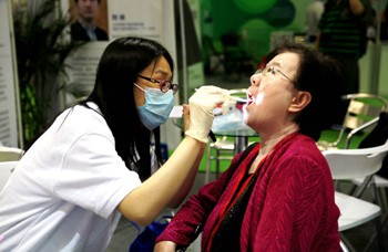 5月4日,一名參觀者(右)在第五屆中國國際養老服務業博覽會現場體驗醫療健康服務。