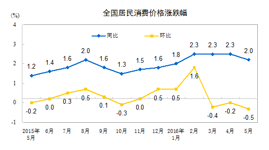 2016年5月份,全國居民消費價格總水平同比上漲2.0%。其中,城市上漲2.0%,農村上漲2.1%;食品價格上漲5.9%,非食品價格上漲1.1%;消費品價格上漲2.0%,服務價格上漲2.1%。1-5月平均,全國居民消費價格總水平比去年同期上漲2.1%。