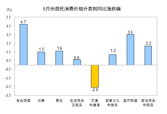 5月份,其他七大類價格同比六漲一降。其中,醫療保健、其他用品和服務、居住、衣著、教育文化和娛樂、生活用品及服務價格分別上漲3.5%、2.2%、1.6%、1.5%、1.2%、0.6%;交通和通信價格下降2.6%。