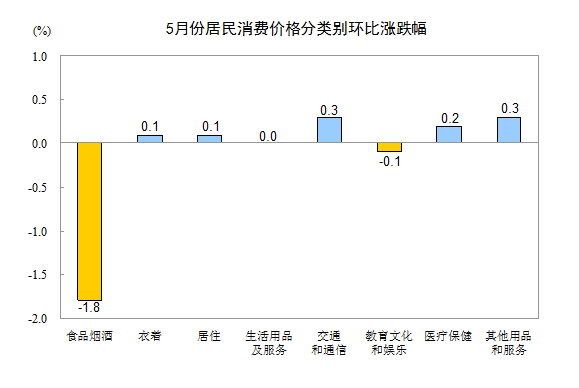 5月份,全國居民消費價格總水平環比下降0.5%。其中,城市下降0.5%,農村下降0.4%;食品價格下降2.7%,非食品價格上漲0.1%;消費品價格下降0.7%,服務價格持平。