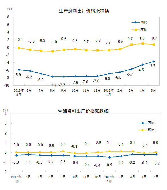 2016年5月份,全國工業生產者出廠價格環比上漲0.5%,同比下降2.8%。工業生產者購進價格環比上漲0.6%,同比下降3.8%。1-5月平均,工業生產者出廠價格同比下降4.1%,工業生產者購進價格同比下降5.1%。