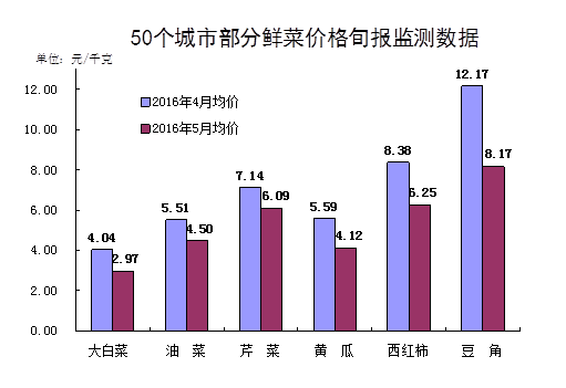 從環比看,CPI環比下降0.5%,主要是受鮮菜價格下降較多的影響。年初寒潮天氣襲擊我國大部分地區,影響了鮮菜的生產和運輸,鮮菜價格高位運行,較往年同期上漲較多。隨著應季鮮菜上市,市場供應逐步增加,鮮菜價格趨于正常。5月份鮮菜價格環比下降21.5%,影響CPI環比下降約0.64個百分點,超過CPI環比總降幅。從50個城市主要食品價格旬報監測看,蔬菜價格回落幅度較大,部分鮮菜價格下降幅度甚至超過三成。5月份豬肉價格環比繼續上漲,漲幅為2.3%,影響CPI環比上漲約0.07個百分點。國內成品油價格兩次提價,汽油、柴油價格環比分別上漲3.7%和3.8%,合計影響CPI環比上漲約0.06個百分點。