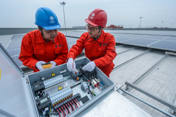 工作人員在浙江省德清縣升華臨杭物流園區檢查屋頂光伏發電設備。 新華社記者 徐昱/攝? |