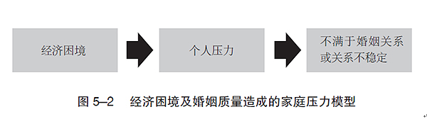 在現存的理論之中,艾奧瓦州立大學社會與行為研究所的蘭特?康格及其同事為我們提供的理論,用簡單易懂的方式極為有效地解釋了經濟條件與婚姻狀況之間的聯系。他們提出的有關經濟困境造成家庭壓力的模型包括三個基本組成部分:(1)經濟困境使得基本需求(比如食物和住宿)難以得到滿足;(2)婚姻雙方都背負了個人的壓力;(3)當雙方溝通時,會在感情中出現更多的負面行為,雙方對婚姻關系整體質量的看法也會更加消極。