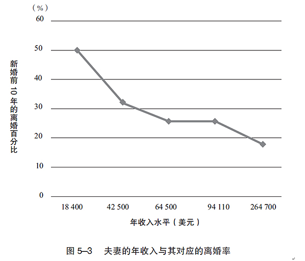 從有關財富和戀愛穩定性的研究中我們可以清楚地看出,經濟困境對于一段感情的正常運轉起著至關重要的作用。2010 年的《離婚與再婚》雜志上發表了一項對30 000 多名女性展開的縱向追蹤研究,結果表明,在新婚的前10 年間,與位于最高年收入前5% (264 700 美元)的家庭相比,年收入位于最后5% 的家庭(18 400 美元)的離婚率要高出2.8 倍。貧困線(23 500 美元)位于收入最低的五分位數與下一個五分位數的交界點,一旦越過這個點,離婚率便出現了17% 的驟減,這也是離婚率下跌的最大幅度。當收入超過中等收入水平(64 500 美元)后,離婚率也隨之出現了輕微的下降,但幅度卻比收入越過貧困線后出現的大幅驟降要小許多。