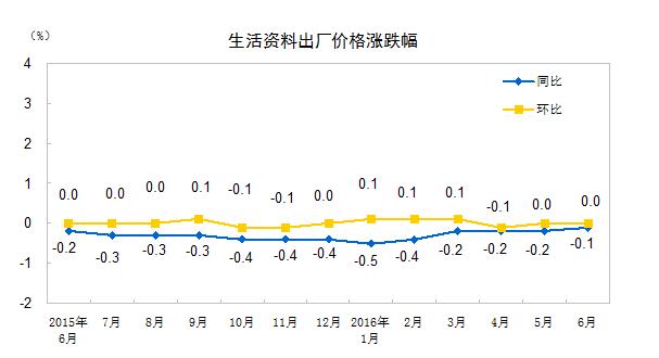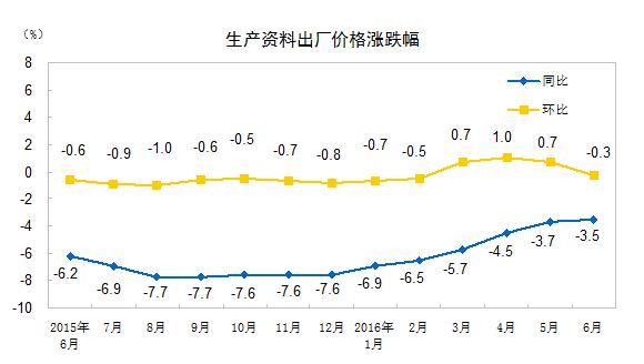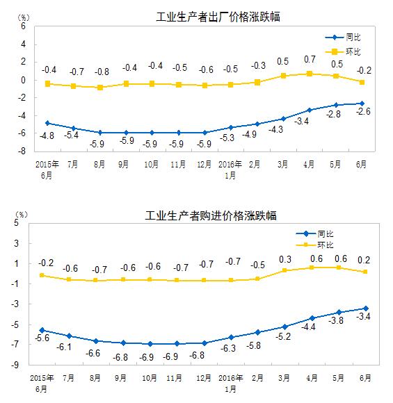2016年6月份,全國工業生產者出廠價格環比下降0.2%,同比下降2.6%。工業生產者購進價格環比上漲0.2%,同比下降3.4%。上半年,工業生產者出廠價格同比下降3.9%,工業生產者購進價格同比下降4.8%。