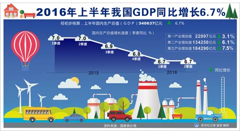 國家統計局日前公布的上半年國民經濟運行數據顯示,上半年國內生產總值初步核算為340637億元,按可比價格計算,同比增長6.7%。分季度看,一季度同比增長6.7%,二季度增長6.7%。專家表示,上半年供給側結構性改革成效初顯,中國經濟穩中趨好亮點不斷。下半年,經濟運行依然面臨內外部多方面不確定性,下行壓力仍然較大。政府在財政政策和貨幣政策上保持穩中求進的總基調,深入實施簡政放權減稅清費和創新驅動發展戰略等五大宏觀政策,預計未來國民經濟將保持平穩運行。