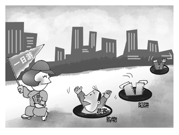 記者調查發現,時至暑期,北京旅游市場亂象也有“抬頭”之勢,“步步驚心”的非法“一日游”既攪亂北京旅游市場,也抹黑了首都形象。從遼寧阜新來京旅游的鄭大爺說,他一家五口、爺孫三代,交了團費1300元、又補交750、強制消費1000元,一天花了3000元,“長城沒看著,反倒擔驚受怕、花錢還得賠笑臉?!?/p>