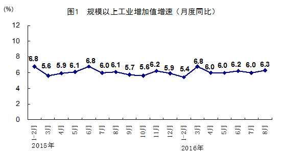 8月份,全國規模以上工業增加值按可比價格計算同比增長6.3%,增速比上月加快0.3個百分點,比上年同期加快0.2個百分點。分經濟類型看,國有控股企業增加值同比增長3.6%,集體企業下降4.1%,股份制企業增長6.4%,外商及港澳臺商投資企業增長6.7%。分三大門類看,采礦業增加值同比下降1.3%,制造業增長6.8%,電力、熱力、燃氣及水生產和供應業增長7.0%。工業結構繼續優化,高技術產業和裝備制造業增加值同比分別增長11.8%和10.8%,增速分別比規模以上工業快5.5和4.5個百分點。規模以上工業企業產銷率達到98.1%。從環比看,8月份全國規模以上工業增加值比上月增長0.53%。1-8月份,規模以上工業增加值同比增長6.0%。