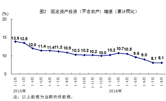 1-8月份,全國固定資產投資(不含農戶)366339億元,同比增長8.1%,增速與1-7月份持平。其中,國有控股投資129551億元,增長21.4%;民間投資225005億元,增長2.1%,與1-7月份持平,占全部投資的比重為61.4%。分產業看,第一產業投資11413億元,同比增長21.5%;第二產業投資143859億元,增長3.0%;第三產業投資211068億元,增長11.2%。高技術產業投資增長較快,1-8月份同比增長15.5%,比1-7月份加快1.3個百分點,比全部投資增速快7.4個百分點?;A設施投資仍保持較快增長,1-8月份同比增長19.7%,比1-7月份加快0.1個百分點。從到位資金情況看,固定資產投資到位資金385535億元,同比增長6.2%。其中,國家預算資金增長20.3%,國內貸款增長9.3%,自籌資金增長0.2%,利用外資下降17.3%。新開工項目計劃總投資323037億元,同比增長22.7%。8月份,全國固定資產投資(不含農戶)同比增長8.2%,比上月加快4.3個百分點;其中,制造業投資增長2.1%,加快0.5個百分點;民間投資增長2.3%,加快3.5個百分點。從環比看,8月份固定資產投資(不含農戶)比上月增長0.58%。