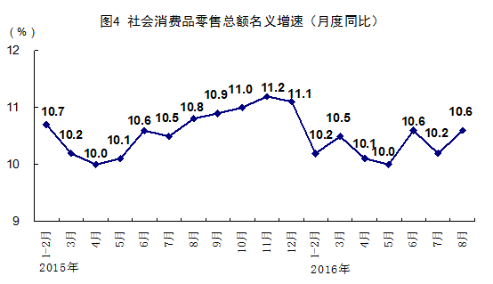 8月份,社會消費品零售總額27540億元,同比名義增長10.6%,增速比上月加快0.4個百分點,比上年同期回落0.2個百分點(扣除價格因素實際增長10.2%)。其中,限額以上單位消費品零售額12250億元,增長8.5%。按經營單位所在地分,城鎮消費品零售額23808億元,同比增長10.6%,鄉村消費品零售額3732億元,增長10.9%。按消費類型分,餐飲收入3036億元,同比增長10.3%,商品零售24504億元,增長10.7%,其中限額以上單位商品零售11475億元,增長8.8%。行類和居住類商品增長較快,汽車增長13.1%,家具增長11.1%,建筑及裝潢材料增長16.3%。從環比看,8月份社會消費品零售總額比上月增長0.83%。1-8月份,社會消費品零售總額同比增長10.3%。