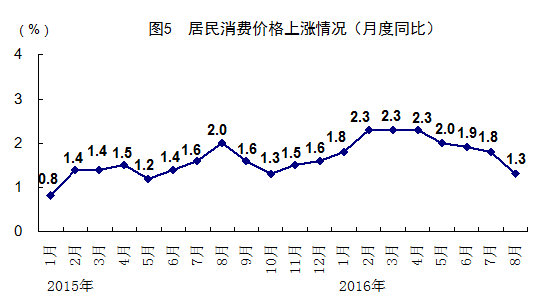 8月份,居民消費價格同比上漲1.3%,漲幅比上月回落0.5個百分點。其中,城市上漲1.4%,農村上漲1.0%。分類別看,食品煙酒價格同比上漲1.5%,衣著上漲1.3%,居住上漲1.5%,生活用品及服務上漲0.4%,交通和通信下降1.2%,教育文化和娛樂上漲1.3%,醫療保健上漲4.3%,其他用品和服務上漲4.5%。在食品煙酒價格中,糧食價格上漲0.3%,豬肉價格上漲6.4%,鮮菜價格下降3.9%。8月份,居民消費價格環比上漲0.1%。1-8月份,居民消費價格同比上漲2.0%。