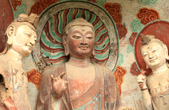 由于麥積山石質皆為紫褐色的水成子母巖,不宜精雕細鏤,所以大多采用泥塑和繪畫,尤以泥塑藝術見長,被譽為“東方雕塑藝術館”。麥積山塑像,主要題材有佛、菩薩、弟子、天王、力士等,盡管歷代塑像同處一堂,但并不因襲模仿,而是保持著各自的時代特色,系統地反映了我國泥塑藝術的發展和演變過程。