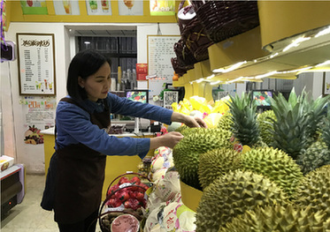 近日,梁培培在自營水果店內為顧客挑選水果。從淮北礦業集團離開至今,不到一年時間,梁培培的生意從當初的一輛雪糕車變成了三個店面,月營業額20萬元。