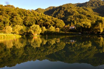 官鵝溝水秀。這里十余個大小不等、形態各異的湖泊,猶如一串綠色的珍珠鑲嵌在溝內,湖水清澈透底,隨湖底地貌高低呈不同顏色,那些倒映在湖中的古樹像一條條巨龍臥在湖底。藍天白云和青山古樹,映入湖中,使天地渾然一體,沒有界限。