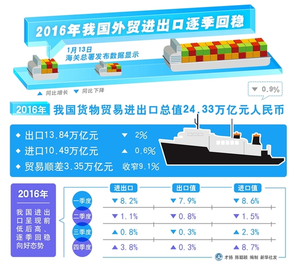 一是全年進出口降幅小于2015年。2016年全國進出口24.3萬億元(折3.69萬億美元),下降0.9%,降幅比2015年收窄6.1個百分點。