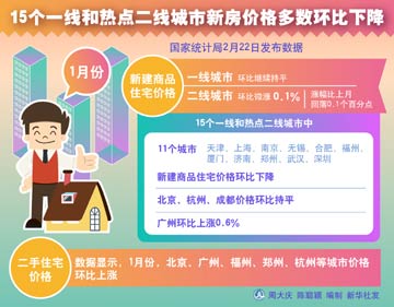 統計局數據顯示,1月15個熱點城市新建住宅價格、11個城市新建商品住宅價格環比下降,降幅在0.1至0.5個百分點之間;3個城市環比持平;廣州市環比上漲0.6%,漲幅已連續4個月回落。