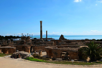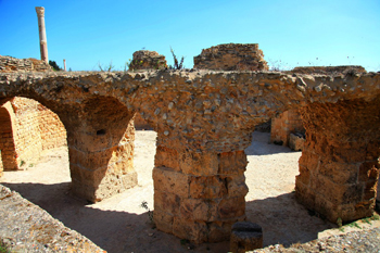 迦太基古城羅馬時代的遺跡殘存較多。羅馬人在比爾薩山上建有大神廟,露天柱廊上則保存有羅馬在迦太基最杰出的勝利神和豐收神的雕像。著名的公共浴場則是在公元145年-162年間羅馬皇帝安東尼時期建成的,是古羅馬的第四大浴場。從基部殘存的柱石、斷墻、拱門可隱約看出兩邊對稱排列的一間間浴室,浴室有更衣室、冷水室、溫水室、蒸汽浴室、按摩室、健身房等。浴場用水則從遠處的山泉通過60公里長的引水渡槽引來。渡槽高6米-20米,至今仍遺存數段渡槽和支架。