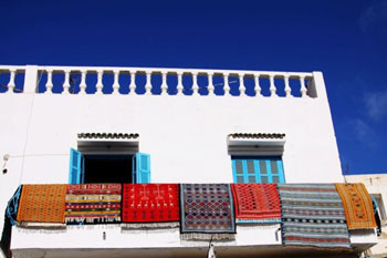 突尼斯海灣的邊上靜靜的藍白小鎮,在透明的陽光中呼吸出了浪漫的色調,這里被譽為“小圣托里尼”。之所以稱它為“藍白小鎮”,是因為這個坐落在地中海邊峭壁上的鎮子,所有的房屋只有兩種顏色,白色的墻,藍色的門窗。如此單純,卻是如此美麗。整個小鎮是沿山勢蜿蜒而上的,布局很簡單,一條鵝卵石鋪就的街道,兩邊是在陽光下閃閃發亮的白色房屋,也有些小巷從屋子內伸出去。房屋都只有二三層高,最讓人感覺仿佛置身于童話的,是那白色墻上鑲嵌著的藍色的鐵窗和藍色的木門。阿拉伯式的蔓藤渦卷展現在鐵窗窗欞,對稱而迷幻;木門上半部的穹頂代表著清真寺的建筑,門上的藍色銅釘則拼合出星星和月亮,還有弓箭、花卉等伊斯蘭圖案,華麗而精美。