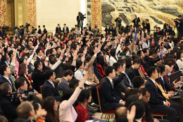 ??? 3月15日,國務院總理李克強在北京人民大會堂與中外記者見面,并回答記者提問。這是記者在舉手提問。新華社記者 金立旺 攝? |
