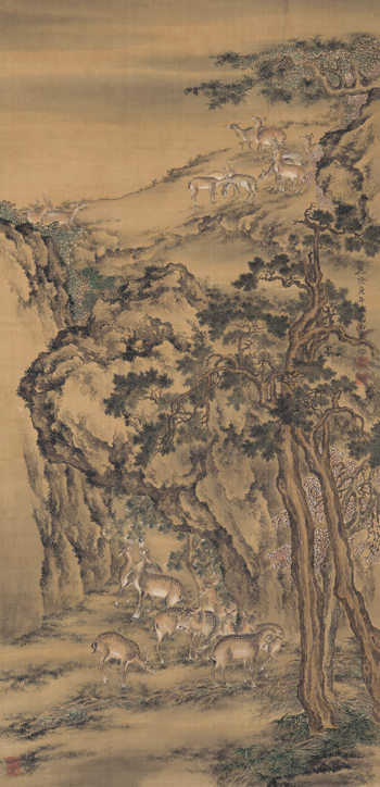 本季古代書畫依然佳作紛呈,清代著名畫家沈銓的《百鹿圖》無疑是其中翹楚。乾隆十五年(1750年),已步入晚年的沈銓寄居于蘇州,他的繪畫技藝更加純熟。就在這一年的春天,他創作了此幅《百鹿圖》。畫中以柏樹作襯,群鹿為主體。古柏蒼勁,喬柯蔥郁。鹿的形態刻畫逼真,渲染精細入微。柏樹刻畫渾厚大氣,柏葉工整輔以花青作襯,運筆時又以勾勒皴擦并用來表現樹干的蒼秀挺拔。整圖構圖豐滿,筆力張弛有度,敷色典雅,極具功力。